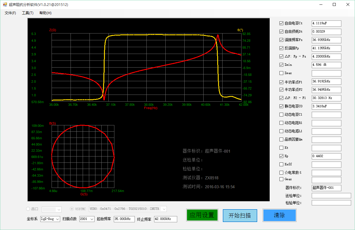ZX70A/ZX80A系列超聲阻抗分析儀在儀器上就實(shí)現(xiàn)掃描圖形,還可以把儀器上屏幕顯示圖形和測(cè)試數(shù)據(jù)直接拷貝到U盤。同時(shí)儀器自帶電腦軟件界面,標(biāo)配版無(wú)需另行購(gòu)買。
